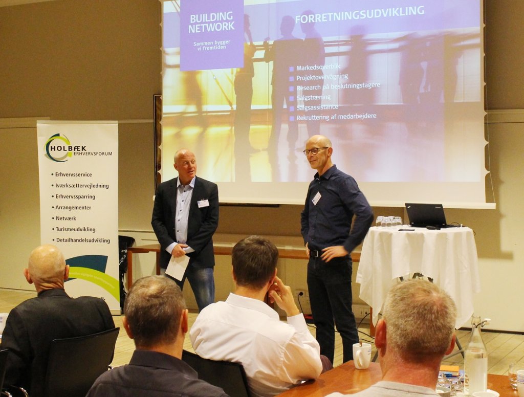 Direktør i Building Network, Mickey Lund, og erhvervskonsulent i Holbæk Erhvervsforum, Niels Nielsen, bød dagens talere og et halvt hundrede fremmødte deltagere velkommen. Det er fjerde gang, at de to erhvervsnetværk i fællesskab afholder netværkskonference. Niels Nielsen servicerer sammen med sine kollegaer i Holbæk Erhvervsforum 600 virksomheder. Desuden forsøger de at fremme iværksætteri og udvikling af virksomheder i Holbæk kommune.