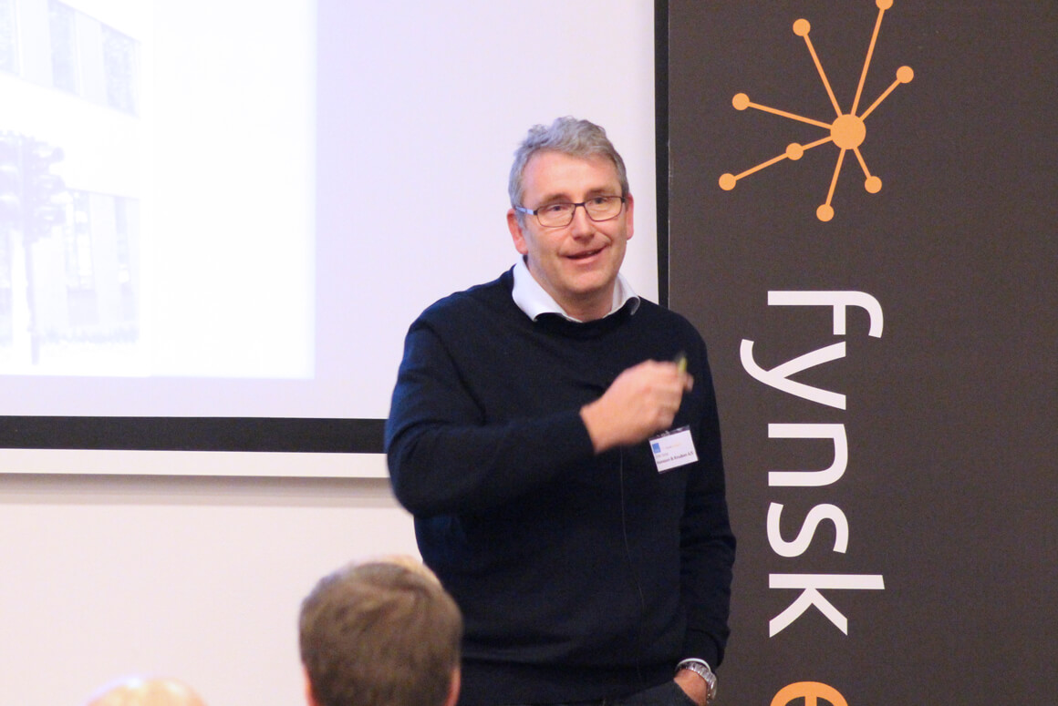Direktør Dirk Voss fra entreprenør-, bygge- og anlægsfirmaet Hansson & Knudsen A/S, der løser opgaver for offentlige og private bygherrer, sluttede oplægsrækken af med at præsentere igangværende og kommende bygge- og anlægsprojekter. Hansson & Knudsen har blandt andet vundet opgaven som hovedentreprenør på en omfattende renovering til 413 millioner kroner af Fyrreparken i Odense-bydelen Vollsmose.